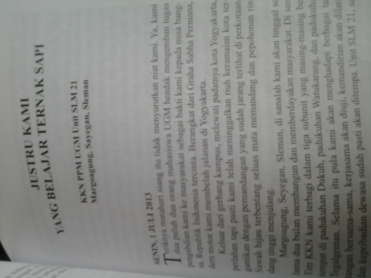 bercerita seadanya atau bahkan mungkin terlalu semangat hingga lupa untuk memperkenalkan diri, ah tapi tak penting juga rasanya. aku hanya ingin sekedar berbagi cerita bahwa “KKN itu tidak hanya “mengajar” dengan sudut satu pihak yang butuh namun “saling mengajar dan belajar”. karena tiap-tiap dari kita tentu memiliki banyak kekurangan, apalagi ketika berada dalam kehidupan bermasyarakat. itulah sebabnya KKN ini sebagai salah satu jalan untuk kita menyiapkan bekal di masa depan tentang “berkehidupan sosial”.