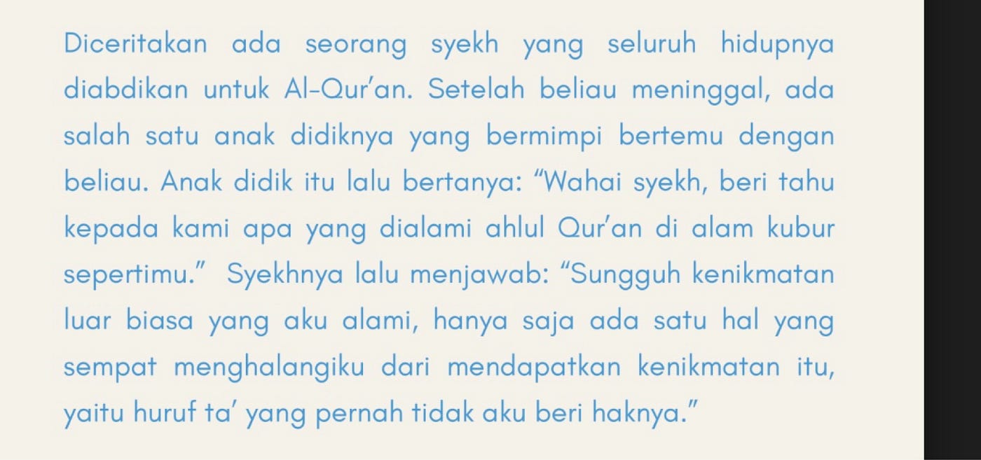 Tapi ada hal-hal yang perlu banyak para penghapal Alquran ketahui terlebih dahulu memang sebelum memutuskan untuk menjalani kehidupan sebagai seorang penghapal. Jika sudah terlanjur, hal berikut ini sepatutnya menjadi hal perlu dikulik juga. Agar ayat-ayat suci itu tidak hanya semata di bibir saja.